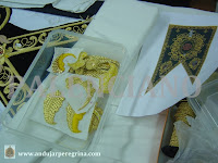 Los proyectos que estás realizando ahora mismo. En cuestión de diseños estoy ahora dirigiendo el proyecto de reforma de la capilla de la Virgen de la Cabeza de El Carpio. En relación con el bordado ahora están en bastidores una bacalá para el Rocío de Linares, una túnica para Andújar, dos restauraciones de sayas para Linares, un estandarte para El Carpio y una bandera también para Linares.